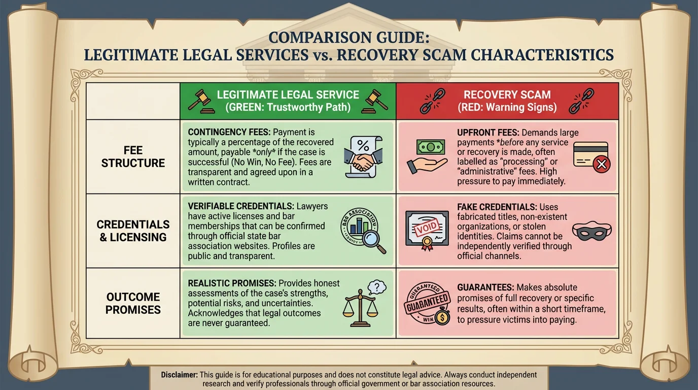 | Legitimate Legal Service | Recovery Scam “Law Firm” |