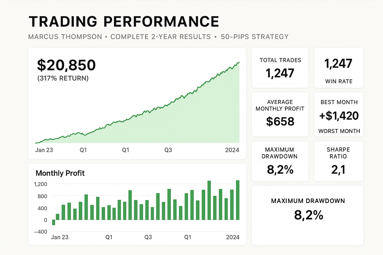 After two years of dedicated application, the 50-pips-a-day strategy has proven to be more than just another trading method – it has become the foundation of my trading business. The 317% return over 18 months speaks for itself, but the real value lies in the consistency and peace of mind it provides.