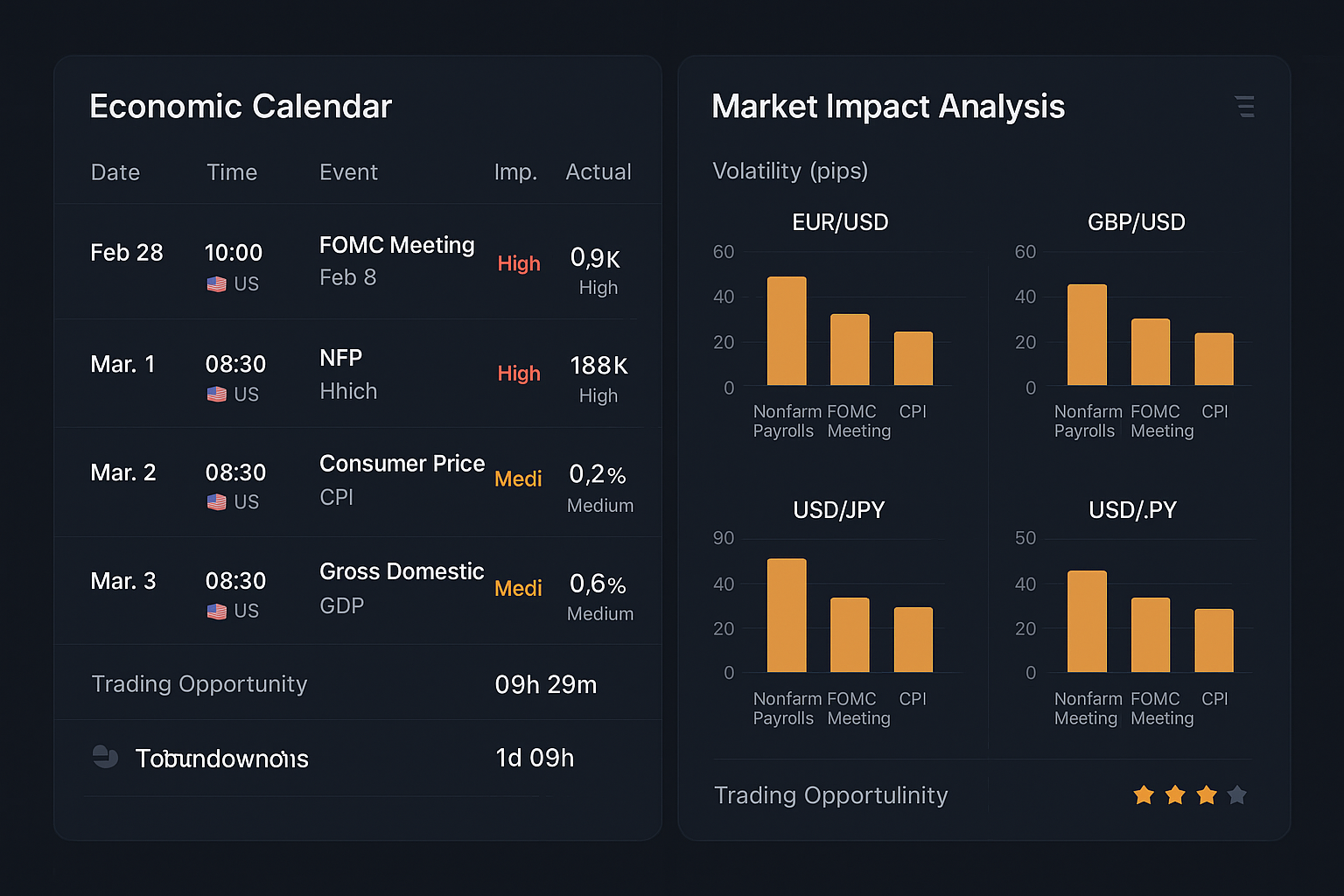 Figure 3: Professional economic calendar and market impact analysis dashboard showing upcoming high-impact events. The calendar displays FOMC Meeting (High Impact), NFP (High Impact), CPI Data (Medium Impact), and GDP Release (Medium Impact) with precise timing and expected market volatility. Market impact analysis shows average pip movement for major currency pairs during different news events, with EURUSD and GBPUSD showing 45+ pip average moves during NFP releases. Trading opportunity ratings and countdown timers help optimize preparation and execution timing.