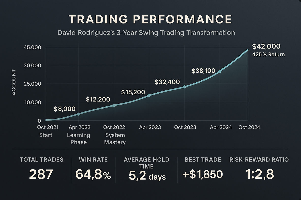 Figure 2: Complete 3-year swing trading transformation showing account growth from $8,000 to $42,000 (425% return), with key milestones including learning phase, system mastery, and consistent performance metrics over 287 total trades.