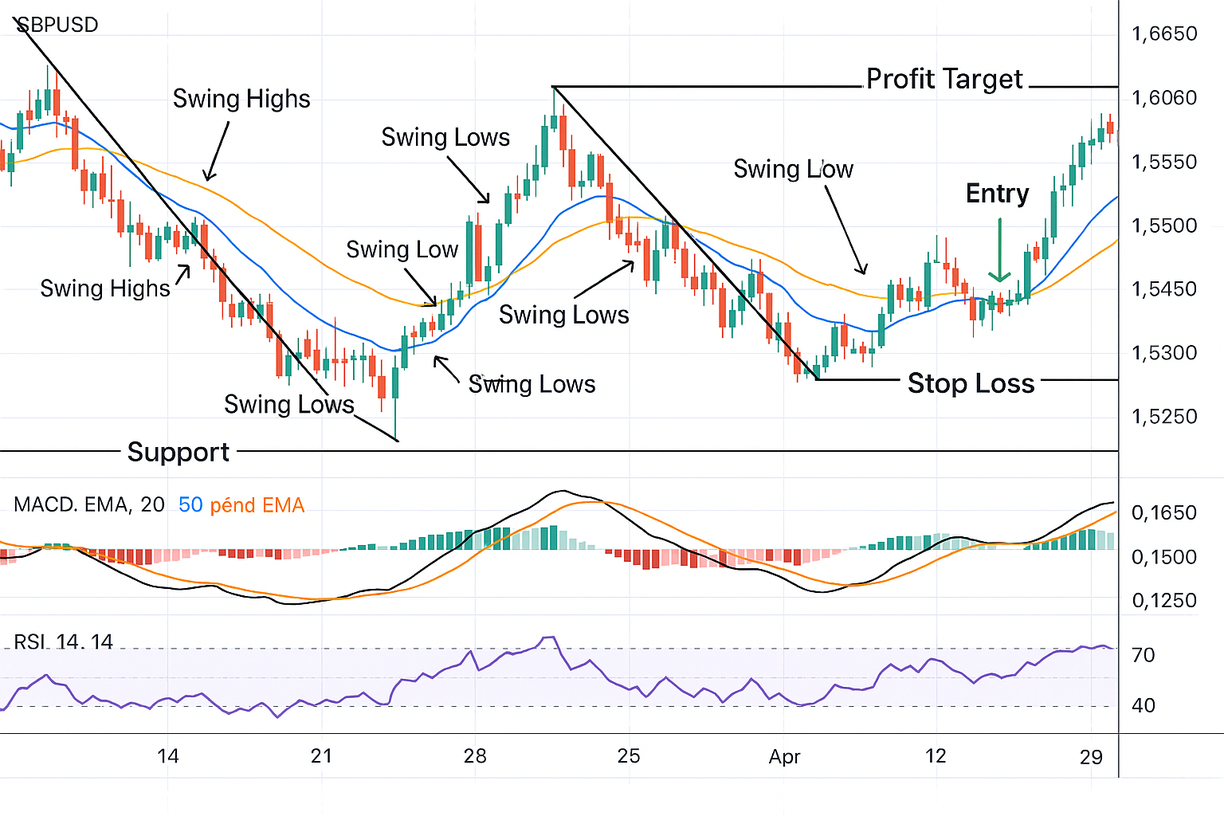 Figure 1: Professional 4-hour GBPUSD swing trading setup showing clear swing highs and lows, trend lines, support/resistance levels, entry points with 50-100 pip stop losses, and 200-300 pip profit targets over multiple weeks timeframe.